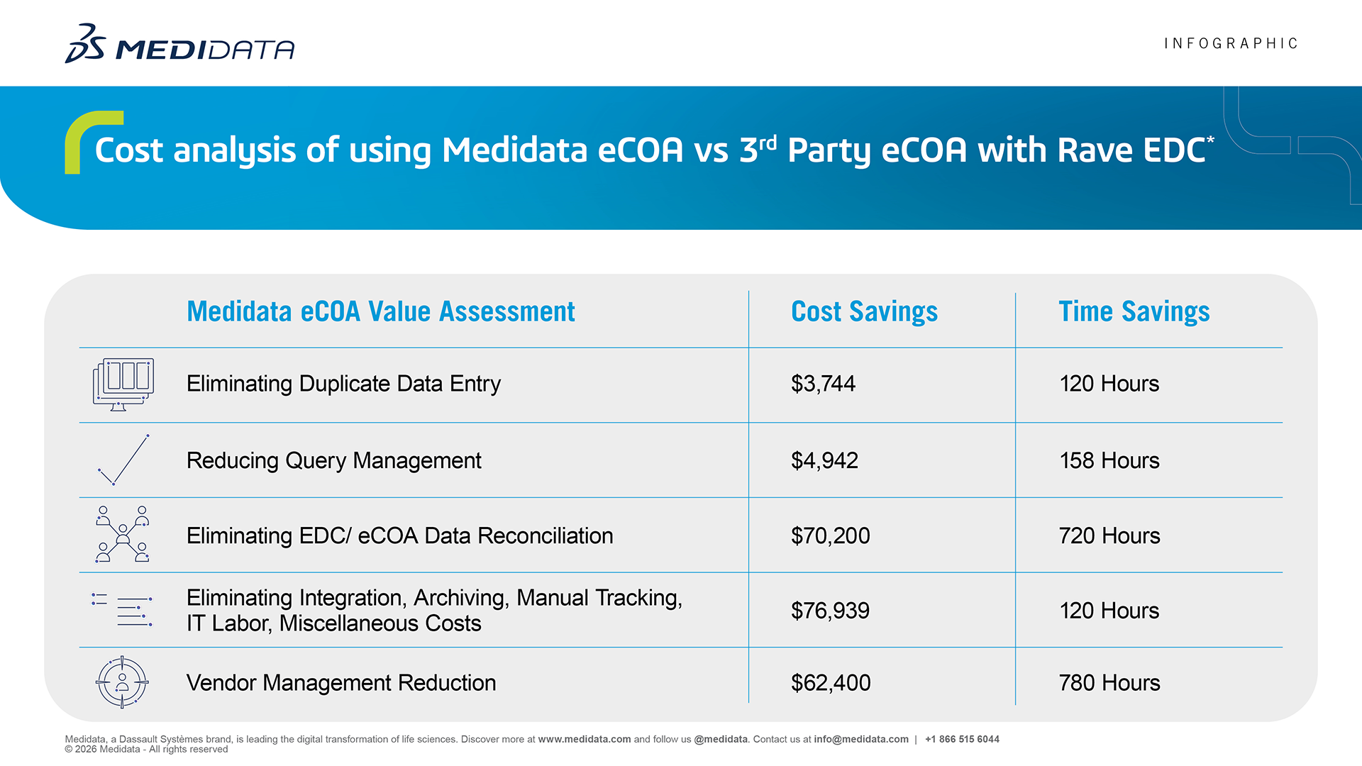 Medidata eCOA supports faster study build and consistent capture of outcomes from patients, clinicians, and caregivers. It helps sponsors and CROs make real-time decisions based on high-quality eCOA data.