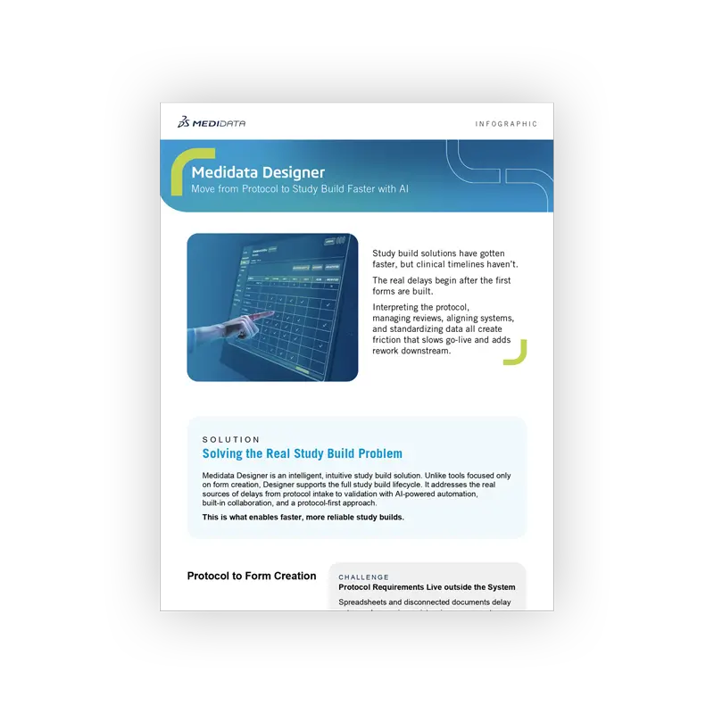 Medidata Designer is a study build solution designed to keep protocol intent, study configuration, and downstream execution connected as change happens.